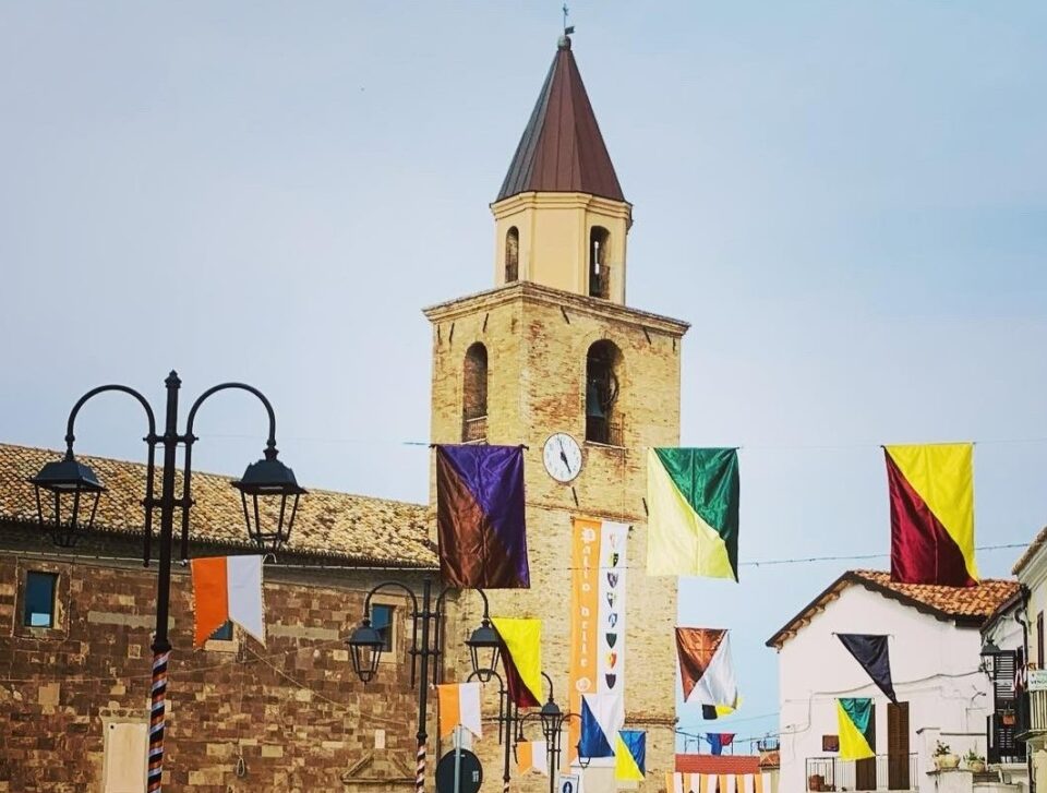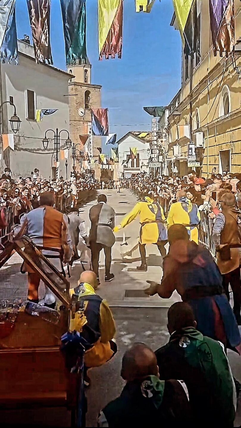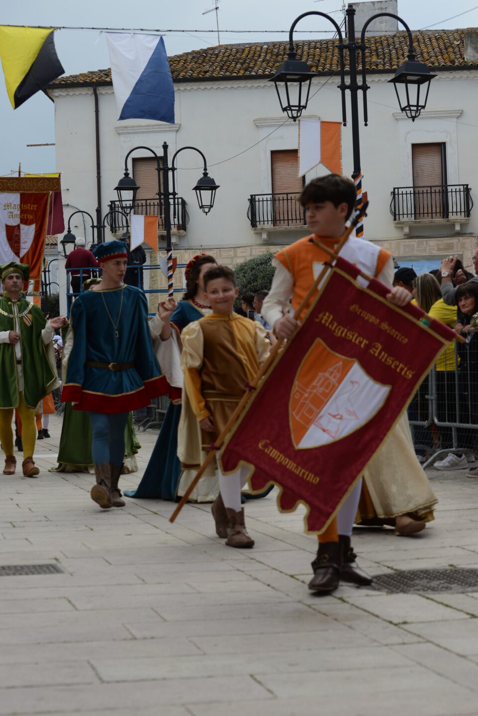 Il corteo aperto da sbandieratori e musici annuncia il passaggio dei nobili Di Capua: Andrea (d’Altavilla), Conte di Campomarino alla fine del 1400 e la consorte Maria d’Ayerba, della casa reale Aragonese, preceduti dalla prole e paggetti, seguiti dal gonfalone del Magister con i suoi Vassalli, per chiamare a raccolta le nove contrade del paese.