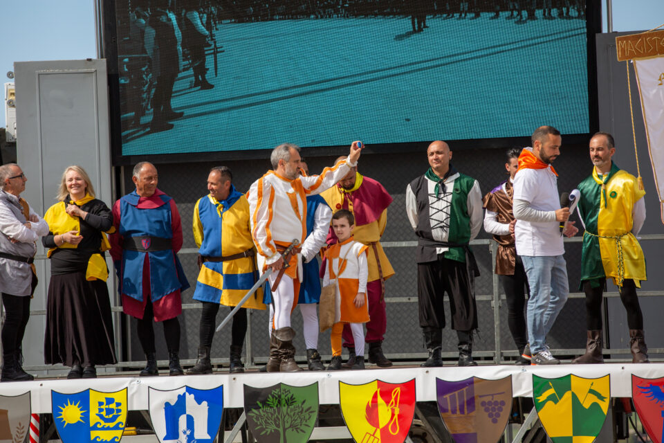 Per l’occasione il paese è vestito a festa con i colori delle nove Contrade. Nel giorno del Palio i contradaioli attendono festosi il passaggio del Corteo Storico, capeggiato dal gruppo storico MAGISTER ANSERIS, con sbandieratori, musici, cavalieri, gentil dame e paggetti per il RADUNO DELLE CONTRADE, giungendo in Piazza Vittorio Veneto per dare inizio al CERIMONIALE.
